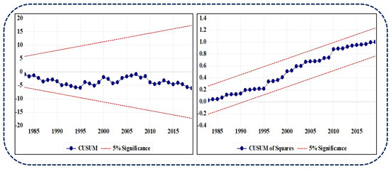 The difference from Equations (3)–(7) is explored via , and error terms are illustrating via -. Similarly, the parameters used in these equations are: 𝜏1-𝜏5, θ1-θ5, α1-α5, η1-η5, β1-β5, and 𝜔1-𝜔5, showing the short-run coefficients, while 𝜏6-𝜏10, θ6-θ10, α6-α10, η6-η10, β6-β10, and 𝜔6-𝜔10 uncover the long-run coefficients in the model. With the ARDL technique, it is possible to confirm the dynamic linkage between the analyzed variables. The null hypothesis has been rejected, which implies there are linkages and interactions between invaders, and reliance on the interlopers’ ingenuity.