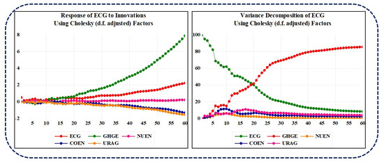 Figure 5 demonstrates the impulse response function and variance decomposition analysis showing up to 60 periods among all variables, including greenhouse gas emissions, nuclear energy, coal energy, urban agglomeration, and economic growth in Pakistan.