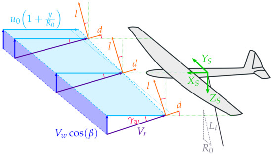 where the relative velocity and its components are defined in Equation (9). Note that (x,y,z) in Equation (9) are still the coordinates in . Therefore, is the relative wind velocity in given a point in the .