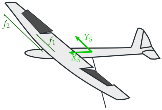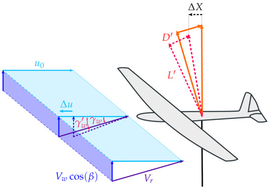 The inflow angle , assumed to be small, is defined as the angle between the relative velocity and the axis measured in the () plane (see Figure 5 for a straight wing). Angle is used to project lift and drag in ; it can be written as the ratio between the third and the first row of Equation (37)