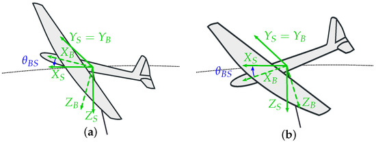 The stability coordinate system (Figure 3) is centered at the tether attachment point and is moving and rotating with the kite. Its origin is denoted as S. Equations of motion are written in , which makes the formulation of the external forces compact. As is defined from the aircraft trajectory, and not from a reference frame attached to the kite, inertial and geometrical properties of the system need to be expressed in for each operational point (i.e., wind speed). This procedure is detailed in Section 4. The rotation matrix which describes a coordinate transformation from to is defined with three sequential planar rotations, around the third, second (rotated) and first (rotated) axes of the frame respectively