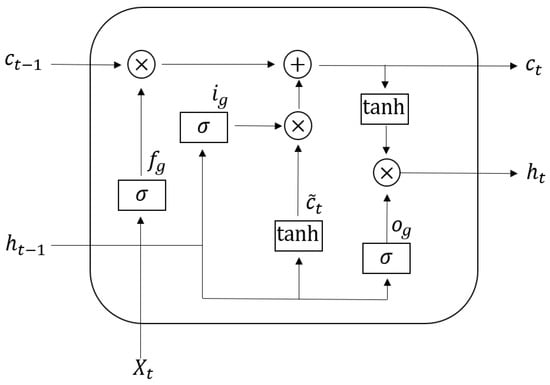 The forget gate uses the sigmoid activation function, generating values in the range between 0 and 1, depending on current input and previous output of LSTM cell according to Equation (1). A value of 0 in the forget gate means that all information in the state of the previous cell must be erased, and consequently will not continue to persist over time. Already a value of 1 in forget gate means that the previous information in cell state must be completely maintained. The input gate works in a similar way, in which values between 0 and 1 can control writing of new information in cell state, according to information of current input, cell candidate and previous state. Similarly, output gate can control output of information that must be read in cell state, also according to values between 0 and 1.