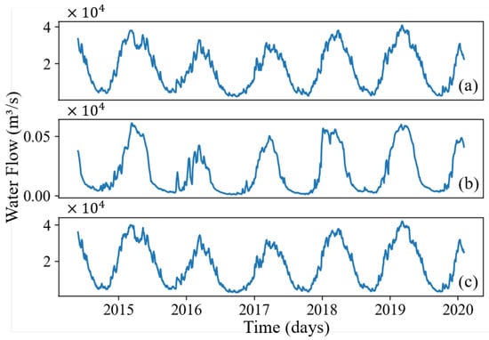 The dataset consists of three time series, containing 2069 daily measurements of flow history from 28 May 2014 to 22 January 2020. Figure 3 shows the original time series from Mamoré (a), Abunã (b) and Madeira (c) rivers.