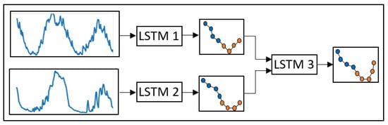 The proposed LSTM ensemble model is divided into two stages, as depicted in Figure 4. First stage has two univariate LSTM networks, called LSTM 1 and LSTM 2, which should generate a 4-day forecast for Mamoré and Abunã rivers time series, respectively. The second stage has a multivariate LSTM network, called LSTM 3, which uses the results of first stage forecasts as an input to forecast 5-days of Madeira River time series [35].