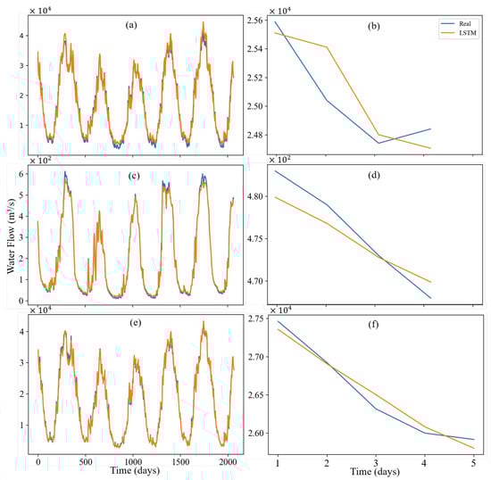 Figure 7 shows the prediction results for the train and test dataset obtained using the best prediction among 30 realizations, compared to the real streamflow measurements. Figure 7a shows the prediction results of the Mamoré River train dataset, while Figure 7b shows the forecast with its four days test dataset. Similarly, Figure 7c shows the prediction results of the Abunã River train dataset, and Figure 7d shows the forecast with its four days test dataset. Finally, Figure 7e shows the prediction results of the Madera River train dataset, and Figure 7f shows the forecast with its five days test dataset. As one can notice, the numerical results of all proposed LSTMs methods (LSTM 1, LSTM 2 and LSTM 3) are close to real the measurements of each river on train and test datasets.