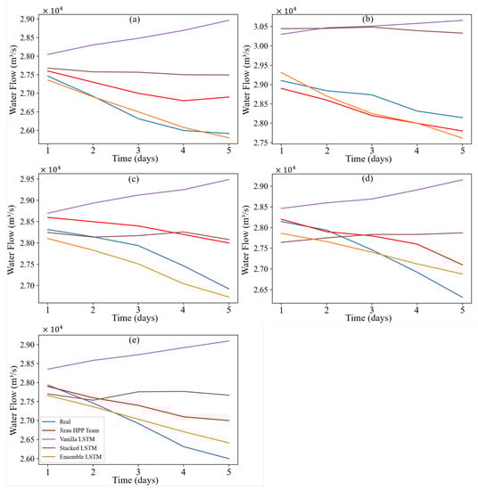 Forecasts of (a) scenario 1, (b) scenario 2, (c) scenario 3, (d) scenario 4 and (e) scenario 5, comparing the real value of the Madeira River streamflow, the forecasts of the Jirau HPP, Vanilla LSTM, Stacked LSTM, and proposed LSTM ensemble.