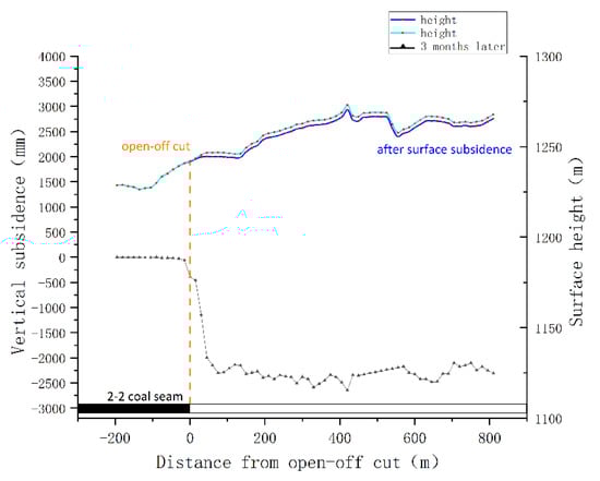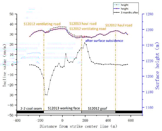 The coal mining subsidence map of observation line B is shown in Figure 6 (see Figure 1c for location). The maximum sinkage value of the inclined line is 2407.8 mm, located in the super sufficient mining area of the working face, 375 m distant from the open cutting hole. The maximum sinkage point is offset to the adjacent S12012 working face. Since the 110/N00 method does not exist to protect the coal pillar, the pressure is released by cutting the top to achieve automatic formation and coal pillar-free mining. The rock fragmentation and expansion characteristics are used to form a larger sinkhole basin. In addition, the ground subsidence affects an area larger than the size of the underground coal mining working face (transport chute and return wind chute), It indicates that the underground mining activities lead to surface subsidence and the horizontal movement and tensile deformation of the ground surface after the breakage of the rock layer.