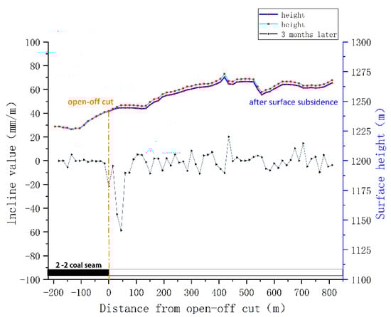 As shown in Figure 4, the tilt value of the observation line point B, which characterizes the degree of damage to the surface coal mining collapsed ground. At point B43, the maximum tilt value is 20.2 mm/m (435 m from the open cut) and the minimum tilt value is 58.8 mm/m (absolute value) at B17 (45 m from the open cut), indicating low tilt value near the open cut and larger values inside the working face. The data reflect that the ground settlement is caused by the sinking basin formed from the underground stratigraphic rupture to the surface.