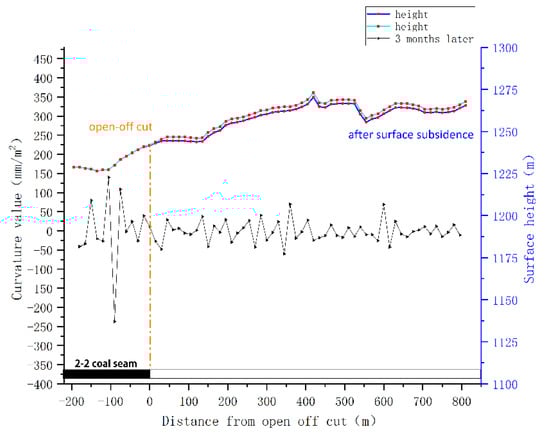 Figure 5 shows the curvature of the observed points in line B. Excluding the anomalies, the maximum curvature should be situated between the boundary point and the inflection point with a value of 141.1 mm/m2. The maximum negative curvature occurs at the point of maximum subsidence with a value of 10.5 mm/m2 (absolute value). Figure 6 illustrates the unevenness of the ground. The presence of negative values in the unmined area documents that the terrain is not flat, and the curvature in the ultra-sufficiently mined area appears as an oscillating and fluctuating type, indicating that the surface deformation in this area is influenced by the topography.
