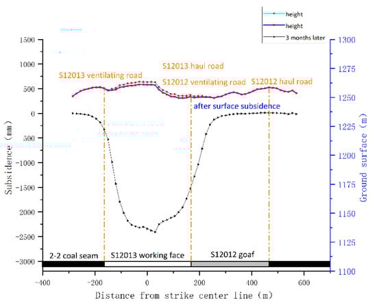 Two pre-mining surface observations were completed after the observation stations were established prior to the formation of the workings. Due to intensive mining activity in the western mining area, the average daily recovery rate is larger than 10 m/d. Therefore, during the recovery period of the S12013 workings, weekly observations were made and second level observations were used to record the settlement process on the ground surface over a long period of time. The accuracy of the second-class level is within 2 mm. Three–five days of fracture distribution monitoring was carried out using RTK. It mainly consists of measuring and recording the height change of the observation point, width change and location of the ground cracks, as well as contours and distribution of the ground cracks. Dynamic fracture monitoring was carried out daily at the gently sloping ground surface in the ultra-sufficient mining area of the working face, recording the location and width changes of the fracture generation. In addition, measurements were continued until the ground deformation was stabilized.