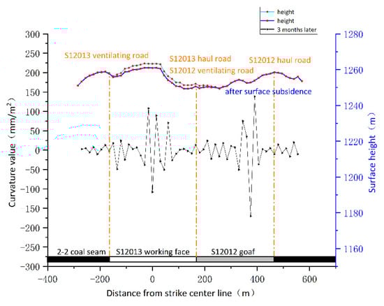 The final curvature curve on the inclined side shows that the two working faces mined without coal pillars will form a new sinkhole basin (Figure 8). The complex surface topography causes positive and negative curvature oscillations in the center of the sinkhole basin, with two maxima at the edge of the sinkhole basin.