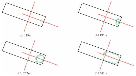 The coal mining subsidence basin area is affected by underground coal mining activities. In the stretching zone for example, the horizontal deformation value is high, the crack opening is high and permanent cracks are easily formed. During the observation period, the dynamic distribution characteristics of the location, length, width, and depth of the surface cracks on the S12013 workings were recorded in relation to the progress of recovery (Figure 12).