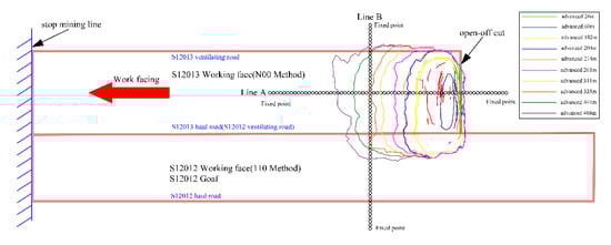 Coal mining destroys the original stress pattern of the overlying rock layer and modifies it. The rock layer moves and deforms from the bottom–up to reform a stable mechanical structure. However, with the expansion of the mining area, the affected area of the rock layer also increases, and the affected area of the surface and rock layer continues to expand. The influence range of the traditional mining method in the wind–sand area is within the working face, whereas the N00 method uses the coal pillarless mining technology, without coal pillar between adjacent working faces. Therefore, the influence range of mining is larger in this case.