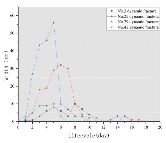 Dynamic fractures in a workface only occur once in the “cracking-closing” cycle. However, Hu Zhenqi et al. [50,51] recognized for the first time the “M”-shaped bimodal development cycle of dynamic fractures and the self-healing feature of rapid closure at the 12406 working face of the Blianta mine in the Shendong mining area. They established a model of the dynamic fracture development cycle T as a function of mining geological conditions. During the observation period, the dynamic cracks of working face S12013 were recorded, and the dynamic cracks with atypical “M” type cycle were recognized. The cycle shown in Figure 14 was recorded for 12–18 days. The second cracking cycle accounted for 5–28% of the first cracking cycle. The cracks shown in Table 4 induce small horizontal deformation. The different overburden lithology and its structural combination may lead to the spatial and temporal variability of the development of surface discontinuous deformation.