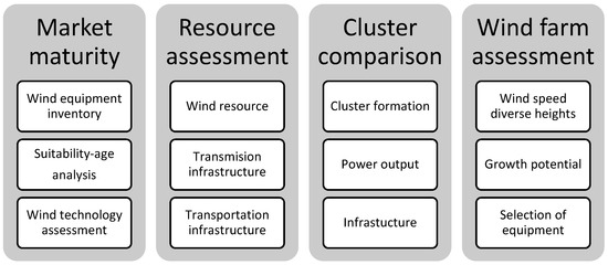 The method developed in this study involves four tasks, each having three individual activities, as outlined in Figure 1. The first task evaluates the degree of maturity of markets, assessing this factor by evaluating the deployed wind inventory, age suitability framework and their obsolescence levels. Resource assessment, the second task in the method, evaluates the goodness of fit of the deployed wind inventory to maximize resource harvesting. The resources are catalogued in meteorological available wind speeds and infrastructure to support these facilities. Cluster comparison, the third task in the proposed method, explores divergences or similarities among wind farms, in proximity of each other, evaluating goodness of fit according to age and technology. The task highlights wind farms that may be having inefficiencies in the use of natural or infrastructure resources, evaluating their obsolescence potential. The last task of the method focuses on individual wind farms, highlighted in the previous tasks, to evaluate their potential for partial or total repowering. Wind farms that may have access to higher wind speeds and area expansions are evaluated for total repowering. These installations may use taller and larger wind turbines, extending wind farm areas to take advantage of better wind potential. Wind farms that do not possess potential improved wind conditions or have limited expansion areas may be considered for partial repowering.