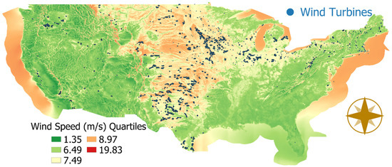 Average wind speeds at diverse heights were obtained from the Global Wind Atlas, developed, owned and operated by the Technical University of Denmark—DTU [42]. Data were provided in raster format with 250 m resolution and information for wind speeds (meters per second) at heights of 10, 50, 100, 150 and 200 m. Data were transformed into vector format to perform geospatial analysis, assessing wind farm suitability and future development in the United States. Figure 2 shows wind speeds in the continental U.S. at a 100 m height overlaid with the more than 60,000 wind turbines from the USWTDB.