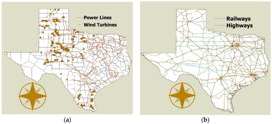 (a) Wind turbines in Texas database with power lines. (b) Highways and railways database.