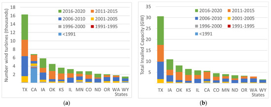 The wind turbine inventory of the United States was evaluated applying data from the USWTDB [40], selecting the 12 states with the highest installed number and NPC turbines. Texas is the state with the most wind turbines, as shown by Figure 4. The second state with the largest number of wind turbines is California, which drops to the sixth place when evaluating installed capacity (NPC). Considering that California is the state with the longest history of wind energy in the U.S., a comparison analysis with Texas will provide insights into the age-performance framework. The oldest wind farms in California were installed more than four decades ago, while in Texas, most of them are slightly older than 20 years. Both states have a large and varied wind inventory to assess their performance and evaluate repowering suitability. As indicated in Figure 4a, in California, more than 3500 of its almost 6800 (51%) wind turbines were installed before 1991, making them more than 30 years old. For this reason, as indicated in Figure 4b, California drops to the sixth place in the U.S. with regards to installed wind capacity. All the wind turbines installed before 1991 contribute just over 4% to total capacity. On the other hand, wind turbines installed after 2010 (which represent 23% of the total wind turbines) contribute 56% to total installed capacity. When comparing with Texas, it is possible to ascertain that 59% of all wind turbines were installed after 2010, and they contribute to 66% of the installed wind capacity. However, gestation of an imbalance is already showing in Texas for wind turbines older than 2005, with 11% of installed wind turbines contributing only 7% of installed capacity. These results indicate that managing the age of the current inventory of wind turbines in the U.S., potentially even before they reach the 20-year limit, is crucial for the successful development of this sector. Substitution of older equipment in a timely manner will allow supplying the grid with increasingly larger power outputs at lower costs to satisfy demand in a timely fashion. Allowing older equipment to remain in operation for extended periods might create a situation where having a large number of wind turbines does not necessarily signify having a good installed capacity.