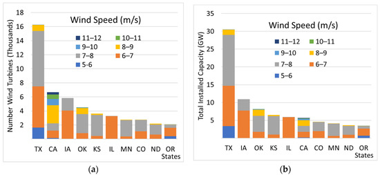Previous literature has assumed that under the first-come first-served paradigm, wind farms installed earlier have selected the best locations for wind energy generation, with newer equipment being installed in progressively less appealing locations [12]. The assumption was evaluated applying the proposed method for the U.S., comparing the age of wind turbines and the wind area in which they are installed. Wind energy data from the Global Wind Atlas 3.0 at a 50 m height [42] were overlaid with the USWTDB data [40]. Average wind speed data for each wind turbine location were extracted and evaluated in correlation with the number of installed wind turbines, the total installed capacity and the year of installation, as shown in Figure 5. Figure 5a indicates that almost 32% of existing wind turbines in California were installed in 9 m/s or better wind speed locations, which none of the other states are able to match. However, as shown in Figure 5b, those wind locations only contribute less than 12% of the installed capacity. In Texas, less than 0.2% of its wind turbines are in area of 9–10 m/s, with all of them installed before the year 2008. Less than 7% are in areas of 8–9 m/s, with only 35% of them installed after 2010. For lower wind areas, it is possible to observe a trend of progressively installing more wind turbines in lower wind areas as time advances: 47% of all wind turbines in areas of 7–8 m/s were installed after 2010, while 65% of wind turbines in areas of 6–7 m/s were installed after 2010.