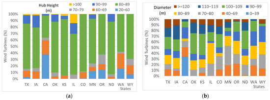 Assessment of (a) hub height of wind turbines by state and (b) diameter of wind turbines by state.