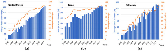 Average rotor diameter (meters) and average hub height (meters) through time in (a) the United States, (b) Texas and (c) California.