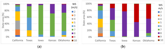 Resource assessment (second task of the proposed method) evaluates the availability of wind resources in the area of the five states with the highest installed wind energy capacity, as shown in Figure 8. State areas are classified according to average wind speed, applying data from the Global Wind Atlas 3.0 considering 50 and 100 m heights [42]. Figure 8a indicates that at a 50 m height, Kansas, Oklahoma and Iowa are the states with the highest average wind speed on a larger proportion of their territories. On the other side of the spectrum, California has the lowest area percentage with higher wind speeds, reinforcing the notion that this state will highly benefit from repowering their wind farms. Texas has almost 40% of its area with an average 7 m/s wind speed, highlighting the importance of managing wind farms’ repowering to avoid suboptimal wind energy extraction. The analysis provides similar results for wind speeds at a 100 m height, as shown in Figure 8b. Significant availability of stronger wind speeds at higher altitudes provides an incentive to evaluate repowering of ageing wind farms. Newer wind turbines with higher hub heights will reach stronger wind speeds, extracting substantially more power.