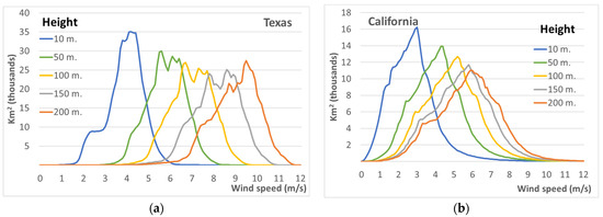Wind speed distribution per area and height according to the Global Wind Atlas 3.0 for (a) Texas and (b) California.