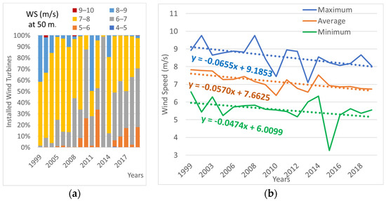 Trends of new wind turbines in Texas per wind speed area (m/s) at a height of 50 m: (a) percentage installed wind turbines and (b) as trend of the change in wind speed area.