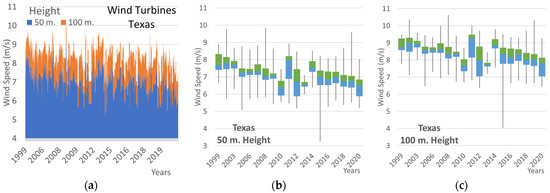 As part of the resource assessment task, results in Figure 11 were generated, evaluating potential improvements that may be achieved through total repowering, increasing turbines’ hub height. These results indicate wind speeds that can be reached from older wind turbines’ locations at a 100 m height. Figure 11a showcases an average increase for all installed wind turbines of almost 1.3 m/s, from 50 to 100 m hub height. Considering that turbines installed 20 years ago in Texas had on average a 60 m hub height (Figure 7), the potential to improve power output with taller equipment would be significant. Furthermore, these figures confirm previous results on the gradual reduction over time of wind speeds as the wind industry grows in Texas. Figure 11b,c further display that wind turbines installed before 2010 have great potential at 100 m height, considering that wind speed distribution above the second quartile indicates consequential availability for 9 m/s and above.
