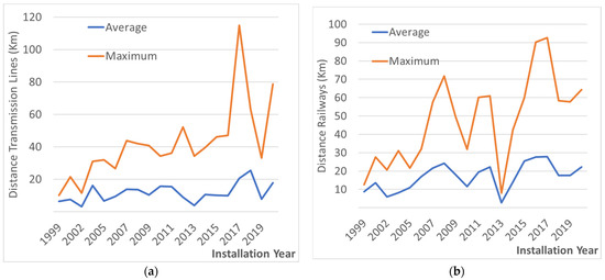 Distance change over time for Texas wind turbines to closest infrastructure. (a) Maximum and average distance of wind turbine to closest EHV. (b) Maximum and average distance of wind turbine to closest railways.