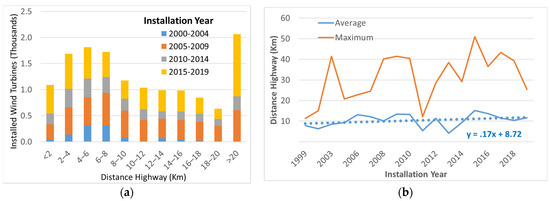 Existing highways and access roads to wind farms are an important infrastructure resource. In the construction phase crews, machinery and equipment are brought using existing highways and roads. During the operational stage, access to facilities to perform maintenance and management road access is very important. Road construction for new wind farms would substantially increase the Capital Expenditure (CapEx), in some cases decreasing the project feasibility. Therefore, distance to existing highways is an important element to reduce costs and improve project viability for wind farms [52]. Accordingly, more than 50% of all installed wind turbines in Texas are less than 10 km away from the closest major highway, as shown in Figure 13a, while more than 85% are nearer than 20 km. These results indicate that from wind turbines in the state in the period 2000–2004, only 1% were at distances higher than 10 km, while for 2015–2020, more than 20% were at distances higher than 10 km. Results reveal that wind farms are progressively being installed further away from major highways, as confirmed by Figure 13b. The average distance from wind turbines after 2006 has fluctuated between 10 and 15 km. Only two years, on which there were fewer new turbines installed (2011 and 2013), generated averages of 5 km. The maximum distance values for four out of the five most recent years have distances of almost 40 km or higher.