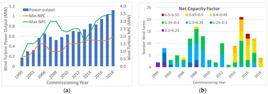 Results presented in Figure 14 evaluate the ERCOT’s Hourly Wind Generation Profiles [43], further highlighting obsolescence as a substantial factor deciding wind farm repowering. Figure 14a shows an almost yearly continuous increase in individual wind turbines’ average power output, generating more than five times the average power output in 2018 compared with 1999, and almost double compared with 2010. Furthermore, the NPC has continuously grown since 2013, with the last three years having the highest values, all above 3.5 MW. Newer wind turbines are clearly outperforming many older turbines that are less than twenty years old. However, when the capacity factor (CF) is evaluated in Figure 14b, results become even starker. Almost all the wind turbines installed before 2014 have a CF of less than 40%. On the other hand, modern turbines have performed at 40% CF or higher over the last six years, with some recent wind turbines achieving values above 50% CF. Therefore, installing advanced turbines in locations of older wind farms will bring the additional benefit of significantly increasing CF values, strengthening the case for total repowering of some Texas wind farms