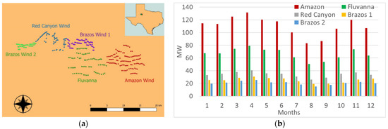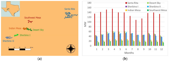 Six wind farms in central west Texas in close proximity to each other. (a) Map showing the configuration of the wind farms. (b) Monthly average power output in 1980–2018.