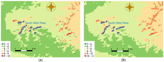 Wind farm assessment (task four of the proposed method) allows evaluation of individual farm repowering, initially assessing the suitability of wind speeds in neighboring areas. The wind assessment provides a better understanding of the direction and scope of the expansion of the facility to install larger wind turbines. Additionally, evaluating the winds at higher altitudes is important, considering the potential to install taller wind turbines, capable of accessing more favorable winds. Figure 16a overlays wind speeds at 50 m with SW Mesa, the oldest of the wind farms in this case study. The analysis clearly displays the potential to grow the wind farm, potentially occupying internal areas of the facility and extending the first north row in both the east and west direction. A large area located 7 km to the east of the wind farm offers possibilities to expand the wind farm in that direction or open a new interconnected section. Figure 16b presents wind speed availability at a 100 m height, further validating the possibility of installing taller wind farms in internal areas of the wind farm and expanding the length of the first north row. The large area to the east of the wind farm continues to provide meaningful growth opportunity for this installation.