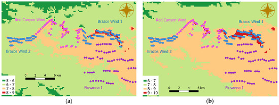 Wind farm assessment (task four of the proposed method) is presented in Figure 18. This second case study evaluates the potential repowering for the three oldest wind farms. The wind speeds at a 50 m height shown in Figure 18a highlight some potential growth to the southeast for Brazos 2 and to the south for Red Canyon. Brazos 1 has a significant area segment on the high 8–9 m/s wind speed range, making it very attractive for repowering. Wind speeds at a 100 m height, as highlighted in Figure 18b, open very consequential opportunities to expand these three wind farms. For both Brazos 2 and Wind Canyon, expansion opportunities arise to the south, with higher wind speeds that can be tapped by applying taller and more advanced wind turbines. For Brazos 1, the opportunities to repower are even more substantial, with a large area opening up to its northeast and creating a large nucleus inside the original area of wind speeds in the range of 9–10 m/s, which is scarce in Texas. Therefore, planning the expansion of these wind farms by applying the proposed methodology provides an insightful tool for stakeholders to maximize wind extraction in locations currently occupied by outdated equipment.