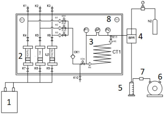 Slim tube unit: 1—High-pressure pump providing a constant flow; 2—piston-type containers; 3—slim tube; 4—back pressure regulator that maintains a constant pressure at the outlet of the slim tube; 5—an oil and gas separator and cylinder with balances to measure the produced oil volume; 6—a gas meter with automatic follow up to measure the produced gas volume; 7—sampling points for gas to conduct on stream sampling while production for gas chromatography measurements; 8—air bath to provide constant operating temperature during displacement tests.