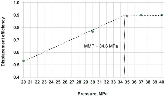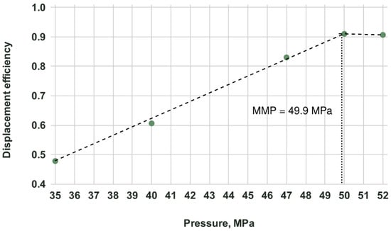 Minimum miscibility pressure was determined using the graphical dependencies of displacement efficiency to injection pressure (Figure 2 and Figure 3). The point region with a displacement efficiency of more than 90% corresponds to displacement in miscible mode, and, at less than 90%, to displacement modes in immiscible or partially miscible mode. The point at the intersection of trend lines passing through points specific to miscible and immiscible displacement is defined as the minimum mixing pressure (MMP).