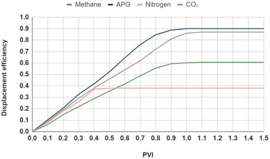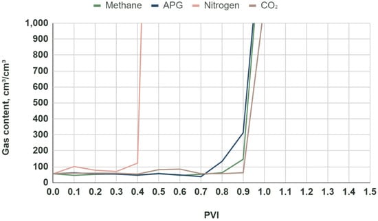 The gas content dynamics are shown in Figure 5. As can be seen in the case of nitrogen injection, we have rapid gas breakthrough and it is not possible to achieve well displacement efficiency. In the injection case of APG, methane, and CO2, the gas breakthrough point occurs at the same time as when injecting 0.9 PVI. For methane, due to its better compatibility with oil, the gas breakthrough occurs later than with nitrogen injection, which makes it possible to achieve a higher displacement efficiency. The highest displacement efficiency was achieved with APG and CO2, but the dynamics of gas content are slightly different. When CO2 is injected, the gas content does not increase until a sharp gas breakthrough. For APG injection, the gas content increases more smoothly from 0.7 up to 0.9 PVI when a gas breakthrough occurs. APG reaches miscibility and the highest displacement efficiency. This makes APG the most effective displacement agent in a scenario of 40 MPa injection pressure.