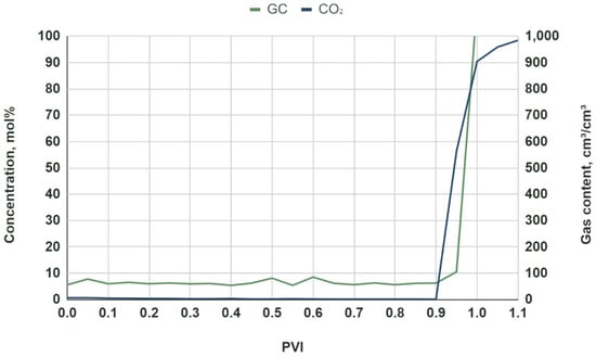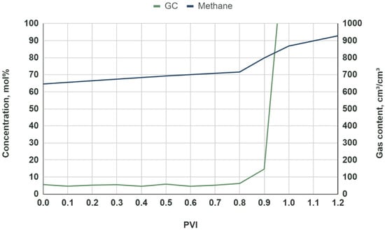 As can be seen in the case of methane injection (Figure 6), there was a gradual increase in methane concentration of up to 0.8 PVI. Then there was a stronger increase in the concentration of methane in the gas composition, coincident with an increase in gas content up until the gas breakthrough. This behavior of methane can be explained by its greater mobility in relation to oil, which indicates incomplete miscibility at the given injection conditions.