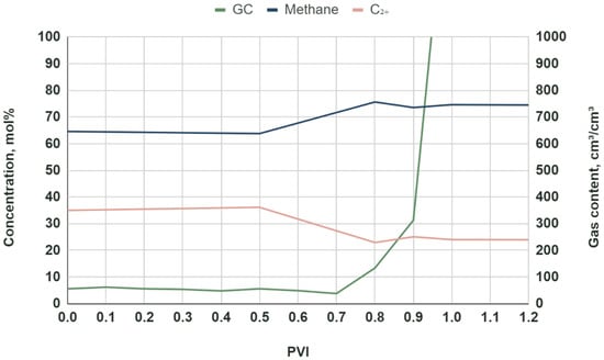 In the case of APG injection (Figure 7), there were no changes in gas composition up to 0.5 PVI. Further, there was an increase in the methane concentration and a simultaneous drop in C2+ components during injection to 0.8 PVI. Starting from 0.7 PVI, the gas content increased until breakthrough at 0.9. Changes in gas composition stabilized after the gas breakthrough. This behavior may be explained due to C2+ solubility in the oil, thus ensuring miscibility in the condensing gas drive (CGD) mode. The PV interval of composition change may indicate the length of the transition zone, in which condensation occurs and miscibility is achieved.