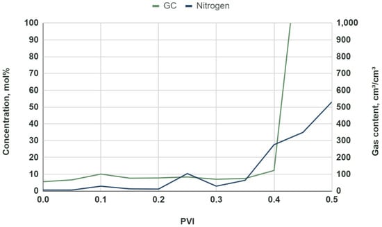 When nitrogen was injected (Figure 8), concentration increased quickly, beginning at 0.2 PVI. Such an early appearance of nitrogen in the separation gas composition and early gas breakthrough indicates its high mobility and correspondingly immiscible oil displacement mode.