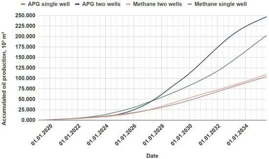 The hydrodynamic model includes four horizontal wells. Two variants of gas injection into the reservoir were considered. The first, injection into 1 well, led to production from the remaining three wells. This option often is the most appropriate, since the mobility of the injected gas significantly exceeds the mobility of the extracted oil and one injection well is enough to provide three production wells with injection. The second gas injection into two wells led to oil production from the two other wells. This option is considered more effective in terms of increasing reservoir pressure. Since the permeability of the pore reservoir is low, it can be assumed that the gas will not break through quickly, and an increase in reservoir pressure to a value close to the MMP will increase the efficiency of oil displacement by gas. The obtained calculation results are shown in Figure 10. The maximum accumulated oil production is demonstrated by the option with the injection of APG into two injection wells. In second place is the option of injecting APG into one well. The difference between these two options is significant at about 25%. This difference is due to the higher average reservoir pressure achieved when injecting gas into two wells, and, accordingly, a greater spread of zones where displacement occurs in miscibility modes and close to miscibility. Methane injection demonstrated less efficiency. The accumulated oil production during methane injection was more than twice as low. It is also worth noting that the injection options in two and in one well for methane practically do not differ from each other, though the average reservoir pressure for a larger number of injection wells reaches higher values. This can be explained by the high MMP for methane, which makes the pressure difference in the two variants insignificant from the point of view of the efficiency of oil displacement.