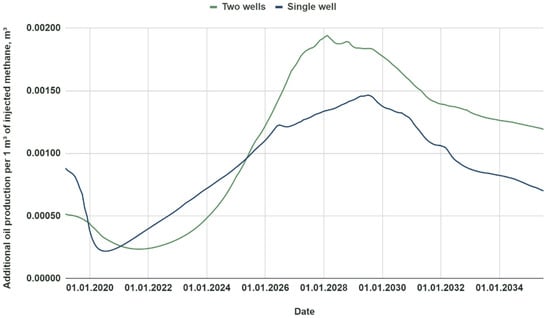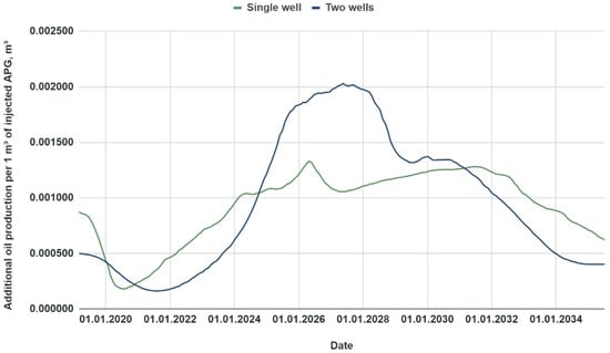 Another aspect of gas injection is that gas is a monetized resource. Injecting gas into two wells means consumption in larger quantities than when injecting it into one well. To analyze the efficiency, dynamics of additionally extracted oil for each cubic meter of injected gas were constructed in Figure 11 and Figure 12.