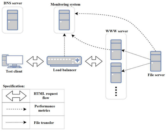 The entire test environment was created in the form of virtual machines running on the Proxmox VE 6.0-7 hypervisor, which runs the latest Debian version 10.3, kernel version 5.0.21-2-pve. The physical server was equipped with two 1.8 GHz quad-core Intel Xeon E5-2603 processors with Intel VT-x virtualization support. The physical server was connected to the network via a wired Intel 82574L network card with a maximum throughput of 1 Gbit/s. The virtual machines were started in QEMU/KVM technology with paravirtualization of the network card. Network access was realized as testing three different load balancers together with load monitoring required the design of one common infrastructure concept (see Figure 1) taking into account the specifics of each solution, and then tailoring the software configuration to the appropriate solution.