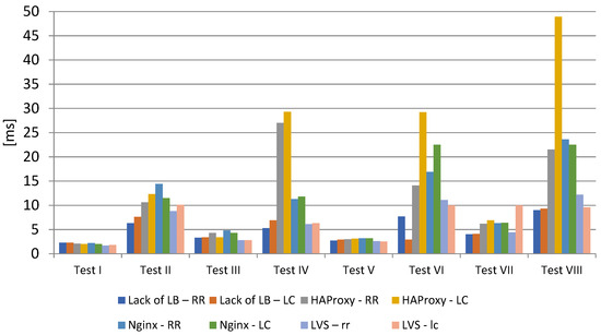 The standard deviation was also low for this infrastructure, so it must be concluded that the long response time was not due to delays in processing the request on the load balancer or the webserver. The compared infrastructures for both traffic-balancing algorithms once again achieved similar results. Therefore, it can be concluded that for this type of infrastructure and technology, the use of the algorithm can be arbitrary, as it does not affect the overall performance of the environment. As shown in Figure 12, the advantage of LVS over HAProxy and Nginx for the average response time was, in extreme cases, more than 6 times (e.g., HAProxy-RR 79.5 ms, HAProxy-LC 93.1 ms, Nginx-RR 80.3, and Nginx-LC 96.7 ms compared to the LVS average of 14 ms). Average overall handling time, similarly to the previous tests, also reached values lower than competitors by almost half (HAProxy-RR 1467.6 ms, HAProxy-LC 1939.5 ms, Nginx-RR 1755.9 ms, and Nginx-LC 1750.7 ms compared to LVS-RR 1095.3 ms, LVS-LC 1074.5 ms). Detailed results are summarized in Table 2, Table 3 and Table 4.