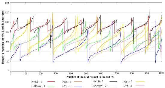 A series of tests showed that for each type of load balancer, the content of the downloaded file does not matter, because the time differences between their types are negligible. The content of the file does not affect the time of its handling by the load balancer. For the analysis, as a type of downloaded file, random characters from the file /dev/urandom were adopted because of the simplicity of generating files of the desired size. Since the purpose of this study was to evaluate the performance of load balancers and not servers, it was decided not to complicate the configuration of backend servers beyond those defined in Table 1.