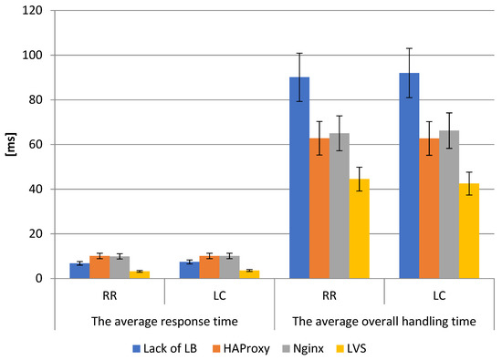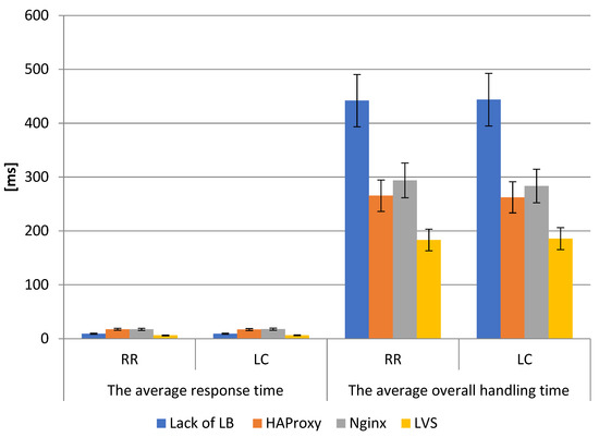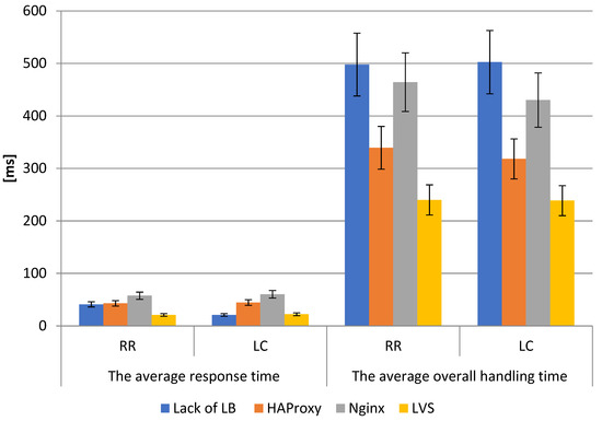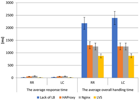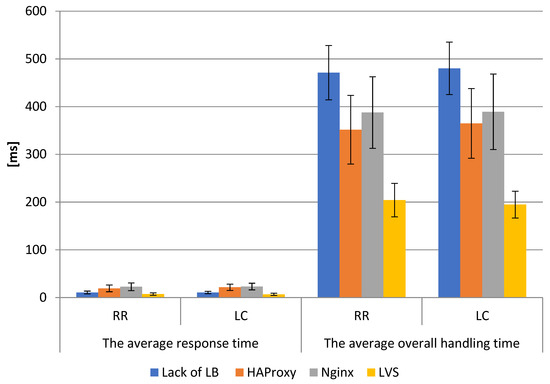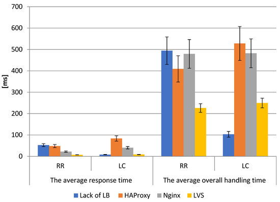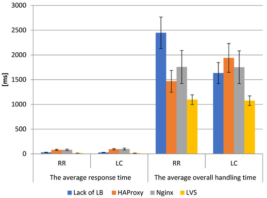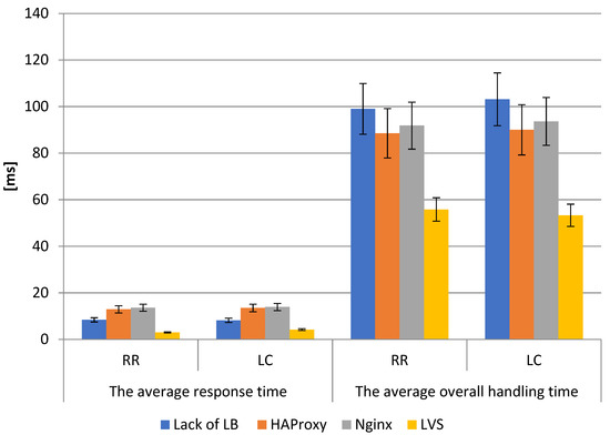 For the least-connection algorithm, similar relationships were observed. Each of the tests were characterized by the occurrence of temporary values significantly different from the average. The highest values were observed for HAProxy and Nginx, and the lowest for LVS. The obtained average simulation results showed that for both the round-robin algorithm and least-connection algorithm, the LVS balancer achieved the lowest values of time to establish a connection, average response time, and average overall handling time. As can be seen in Figure 2, Figure 3 and Figure 4, the time to establish a connection is similar for all LBs, but already the average response time (10.1 ms for HAProxy, 9.9 ms for Nginx) and average overall handling times (about 90.1 ms without LB, 62.8 ms for HAProxy, and about 65 ms for Nginx) are much lower for LVS (the average response time about 3.5, while the overall handling time 43 ms). The difference in average response time for HAProxy/LVS and Nginx/LVS was nearly 300%, and the average overall handling time for without LB was over 200%, for HAProxy/LVS over 145%, and Nginx/LVS about 151%. As one can observe, the graphs show the average values of each parameter with standard error bars. Detailed results are summarized in Table 2, Table 3 and Table 4.