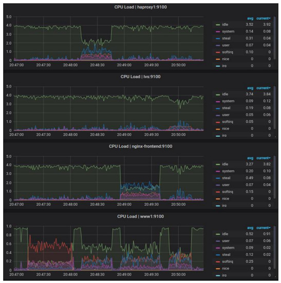 The data collected in Table 2, Table 3 and Table 4 show that the traffic-balancing algorithm is insignificant for these inputs. Again, the best software in both comparison categories was LVS. The highest standard deviation was characterized by not using a load balancer. The Nginx software also proved to be less efficient than HAProxy and had less stability. Figure 5 shows the CPU load of the load balancers.