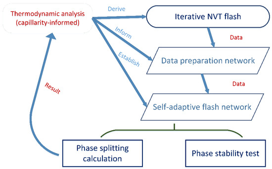 In order to overcome the limitations of the current phase equilibrium calculation methods and the accelerated approach using the deep learning technique, a thermodynamically consistent phase equilibrium calculation scheme is proposed in this paper, as shown in Figure 1. This work starts from the realistic equation of state and a thermodynamically consistent NVT type flash calculation method is generated as discussed in Section 2. Using iterative calculations, sufficient data can be prepared for the further training and testing purposed in the deep learning algorithm, and the network structure is also designed based on thermodynamic analysis to determine the input and output features. A two-network structure is established for the adaptive flash calculation, with one network for data padding and the other one for phase equilibrium prediction. Both phase stability test and phase splitting calculations are involved in the output of the flash network, which informs both the number of phases at equilibrium and the compositional mole fraction. The predictions can be further analyzed using the thermodynamic scheme. As illustrated in the figure, data are transferred through both the iterative flash calculation scheme and the accelerated deep learning scheme, and thermodynamic analysis plays a role in the whole process. Such a coherent and complete phase equilibrium calculation scheme is believed to be capable of providing fast, accurate and robust thermodynamic foundations for further multi-component multi-phase fluid flow simulation [39]. It should also be noticed that the thermodynamic correlations among the input features are now described by the inner connections of the hidden layers and nodes, as well as the usage of activation functions, to replace the conventional thermodynamic models represented by EOSs. If the trained model as a liner combination of the nodes and activation functions is verified to meet well with the ground truth data, i.e., iterative flash calculation data in a wide range of environmental conditions, it is reasonable to state that the thermodynamic rules in the phase equilibrium calculations are well-informed in the proposed deep neural network.