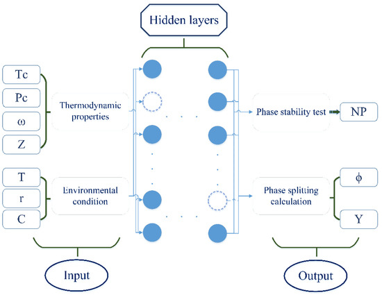 In order to accurately describe the complex thermodynamic laws in the phase equilibrium investigations, it is difficult for the model trained by the deep neural network to fully avoid the overfitting problem caused by the high complexity, which affects the final prediction effect. Dropout is a common method that eliminates the corresponding connections by discarding certain nodes in the network, thereby significantly reducing the degree of freedom of the model. As shown in Figure 2, the dotted circle in the hidden layer represents the node eliminated by the dropout technique. After evaluating all nodes and connections with certain probability, the training of the model will be performed on the simplified network after dropout. It should be pointed out that in order to maintain the robustness of training and conservation of the physical laws, before the start of the next training cycle, it is necessary to use the initialized coefficients to insert the discarded nodes back into the model for re-evaluation and dropout operations.